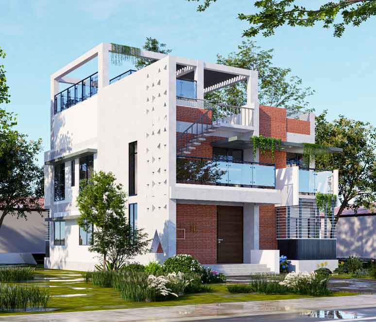 The residence offers spacious living and private zones distributed across two levels, with open terraces and balconies that connect indoor spaces to nature. Large glazing ensures natural light and ventilation, while the landscaped boundary enhances privacy and creates a serene environment.